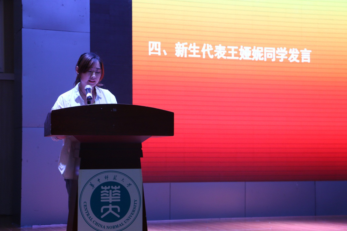 之后,新生代表博士生王娅妮同学发言,王娅妮同学结合自己硕士阶段的科研经历,强调了在化学科研中要做到诚信科研,树立正确的人生目标,并要勤奋刻苦的向着自己的目标奋斗,成为一名合格的研究生。