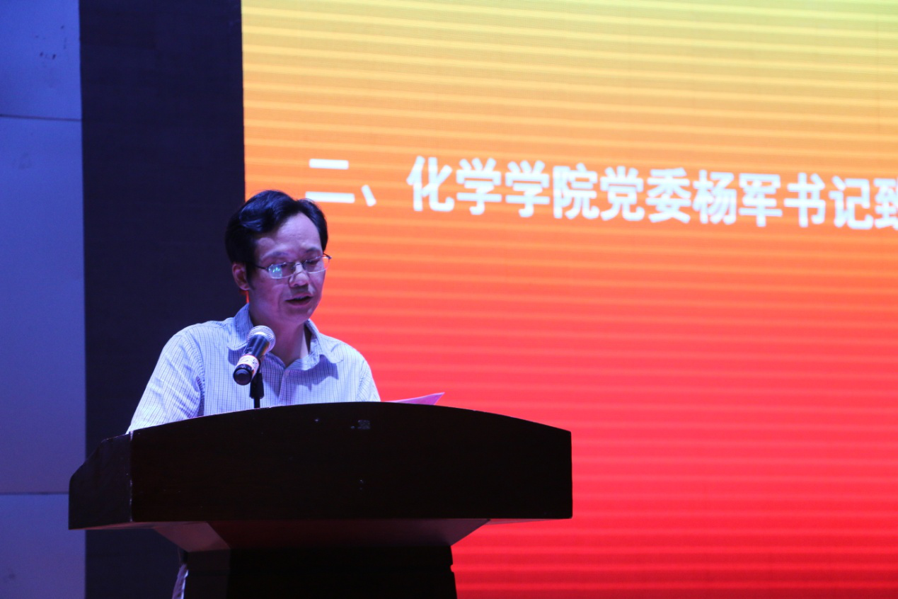 典礼开始之前,223名博士、硕士新生们首先观看了化学学院宣传片,典礼在庄严肃穆的国歌声中拉开序幕。化学学院党委书记杨军首先致辞,杨书记首先代表学院对全体研究生新生表示了热烈的欢迎和衷心的祝贺,并希望大家在未来的生活中能够享受桂子山上美丽的风景,在学习中能够养成勤奋刻苦的好习惯,在科研中发挥“忠诚博雅,朴实刚毅”的华师精神,从而提高自身的能力,拥有一段美好的学习经历。