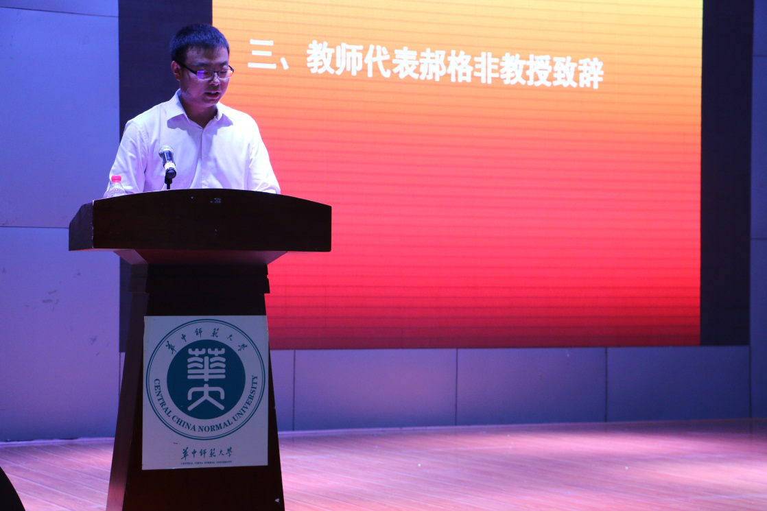 接着青年教师代表郝格非教授讲话,郝老师分享了自己在桂子山的求学经历以及张景龄先生的科研经历,并希望同学们能够珍惜在桂子山学习、生活的日子,爱上桂子山。