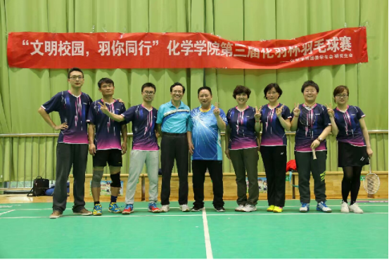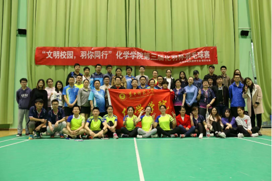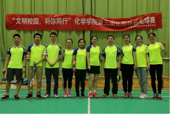 2017年4月9日,“文明校园,羽你同行”化学学院第三届化羽杯羽毛球比赛教工和研究生团体赛决赛在校乒羽中心进行。化学学院党委书记杨军,张礼知、艾智慧、郭军、原弘等多位教师作为参赛选手参加了本次比赛。化羽杯是化院春季运动会的传统大型项目,老师、研究生、本科生齐上阵,同台竞技,参与度逐年提高,旨在通过体育活动的开展,引导学院全体师生在紧张忙碌的工作学习之余,不忘锻炼身体,增进师生交流,紧密导学关系,倡导健康生活。