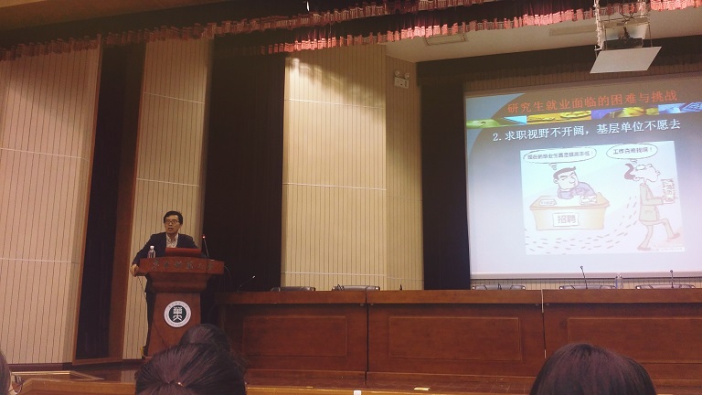 范书记首先从国家层面的宏观角度和个人层面的微观角度分析了目前的大学生就业形势。他从去年“公务员考试中900人竞争一个岗位”的例子指出,虽然就业形势的是严峻的,但是这更是一个展示华中师范大学形象的绝佳机会,展示华师人的内涵与素养的一个挑战。