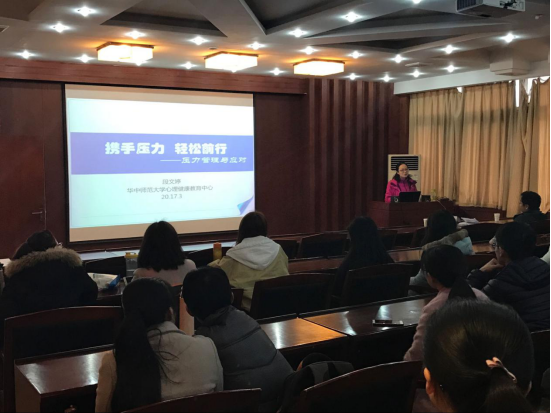 (通信员:刘桂英)2017年3月21日下午14:30,华中师范大学化学学院在化学楼五楼报告厅开展了关于“携手压力,轻松前行”的心理健康专题讲座。此次活动由院研究生会主办,聘请了近10年来一直致力于心理健康课程教学与科普知识宣传并对个人和团体提供心理咨询服务的中国心理学会注册心理咨询师、华中师范大学心理健康教育中心专职教师段文婷老师为主讲人。