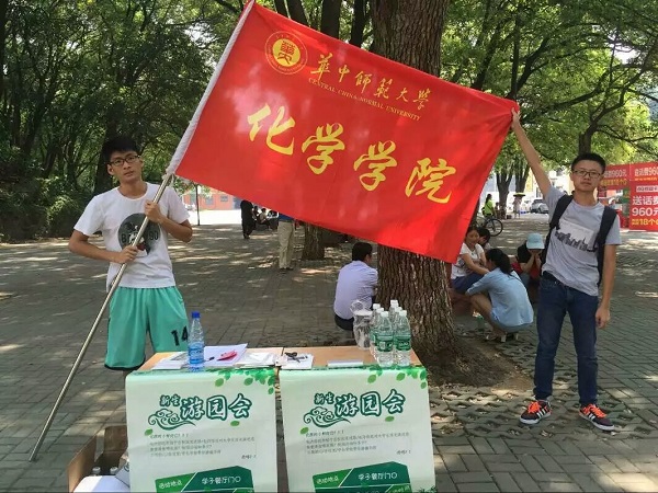 上午10时,15级的志愿者们早早举着化学学院的院旗,在东区小树林前等候前来参与游园会活动的新生们。据社团部工作人员介绍,前来参与游园会的新生时间不一致,难以协调,因此15级的志愿者们采取了化整为零的方式来开展这一活动。即一旦来了几位新生就会有一位志愿者带领她们去参观学校,不必等待其他同学。