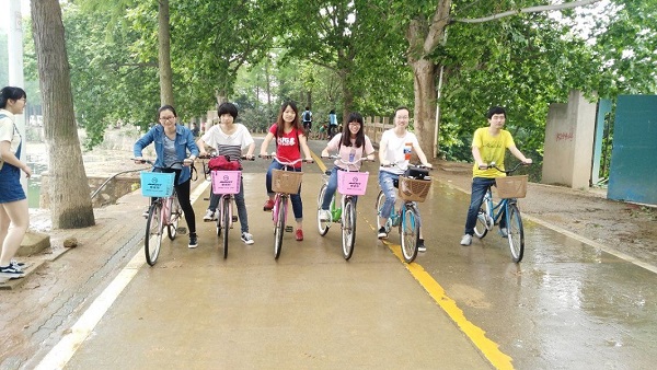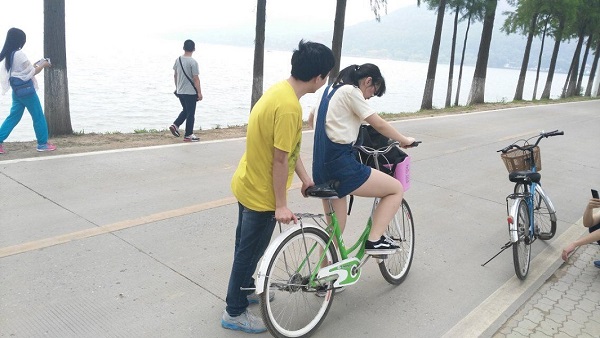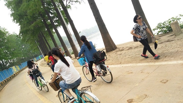 经过半个多小时的车程,同学们踏入了绿水环绕的东湖秀景中。安排好单车和人员分配后,首先进行“菜鸟”教学的环节。由班长曹扬伟和罗睿同学作为骑车“教练”,积极向几名单车技术不熟练的同学传授技巧和方法,其余同学也参与到教学过程中来,为他们加油打气,相互分享着自己学习骑车的趣闻趣事。在同学们的一致努力下,不多一会儿,“学员”们都顺利“毕业”,基本掌握了单车技巧。一行人迎着明媚的阳光开始了环东湖单车行的游览旅程。