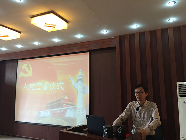 在庄严的《国际歌》歌声中,宣誓仪式正式开始。院党委副书记范重庆同志带领全体党员宣读入党誓词,各位党员右手握拳,面向党旗,神情庄重而严肃。