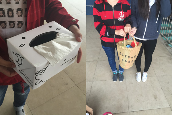 第一个完成的作品是707寝室的同学用废弃的快递纸盒制作的抽纸盒。抽纸盒整体为白色,上面绘有各种卡通图案。707寝室的韩爱翠也介绍了她们制作抽纸盒的原因:“这个抽纸盒制作比较简单,材料也容易获得,大家都可以做,并且我觉得抽纸盒还是挺实用的。”707寝室的同学在完成自己的作品之后,还帮助了711寝室的同学用废旧的布袋制作了脏衣篓,脏衣篓没有加以过多的装饰,但在投票环节,脏衣篓的实用性得到了同学们的肯定。