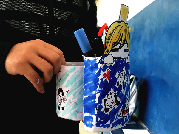 在第一个作品完成后,其他同学的作品也陆续完成,其中710寝室的同学用沐浴露瓶子和饼干罐制作的笔筒受到了大家的一致称赞。她们的笔筒由笔筒和收纳盒两个部分组成,笔筒上绘有精美的卡通图案,收纳盒上还写有寝室号的艺术字。这件作品在最后投票评选环节中以八票的成绩获得了第一名。