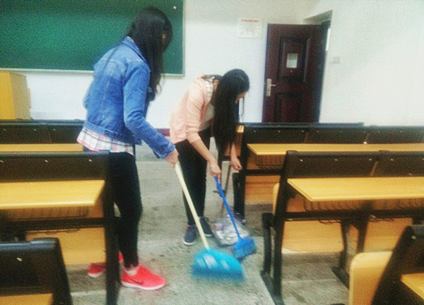 17日早晨8点,美化教室的小组成员出动了,一起动手为七号楼1楼教室的黑板、讲台、地面、抽屉进行了打扫和清理,并在教室内贴上标语“举手投足之间,彰显文明魅力”,意在呼吁同学们讲究卫生,来上课学习的同时也要保护好我们的教室环境卫生,做一个文明读书人。