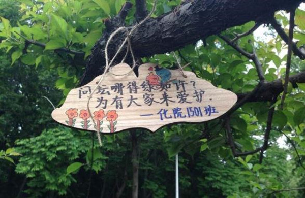 本次团日活动的最后一项公益活动于本日上午10点开展。小组成员齐心协力,明确分工,亲自做好各种花草牌,写上各式新颖的标语,并带上凳子对博雅广场周围的树木进行了挂牌。