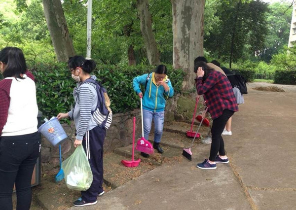 挂牌的同时,另外的同学对从大学生活动中心旁的杜鹃广场到绝望坡再到博雅广场最后到化学楼的沿线进行落叶和垃圾的清扫。一些同学拿着扫把和铲子铲扫路旁落叶和飘絮,一些同学用小刀刮除花台上的标签贴纸,几个同学拿着抹布把垃圾桶擦拭干净。此项活动的遍及范围大,同时影响也很大,同学们忙碌的身影吸引了不少路过的同学、老师和阿姨的目光,他们拿出手机拍照或录像记录下同学们的这一活动过程。活动时,组长采访了一位一直在一旁看着的阿姨,阿姨对同学们的行为大加称赞,说道她认为这是一件有意义有价值的事。