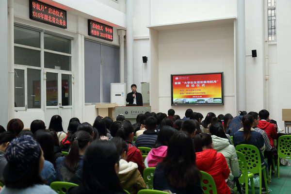 启动仪式由就业处钟文锐老师主持。就业处副处长郎东鹏介绍了本次活动的重要意义。他说到,举办本次大学生生涯发展活动在我校历史上属于首次,对华师学子进行生涯规划和求职就业具有指导作用。并预祝本次活动能够顺利开展。物理科学与技术学院2015级辅导员淦丽霞老师上台介绍了首届“大学生生涯发展导航月”的系列活动。本次导航月以“春风化雨,生涯炫彩”为主题,以生涯探索和生涯规划为核心,内容包含生涯辅导讲座、生涯团体辅导、职场人物分享会、创新活动、职业规划和求职指导现场咨询日等类型,持续时间为一个月。