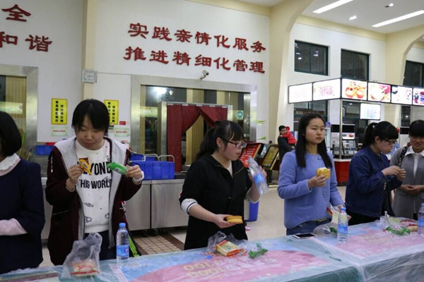 值得一提的是,本届美食文化秀中新增加了“谁是大胃王”环节。这一环节中,各个小组展开了吃零食大战。摆在各位选手面前的是面包、辣条和矿泉水等食物,随着主持人的一声令下,选手们立马狼吞虎咽起来,一口面包还未咽下,矿泉水的清凉感便已到了喉中。同组成员在一旁鼓励和协助,恨不得能替选手多嚼上几口……现场引来了不少同学的围观,这一环节成功将现场气氛点燃,成为本次活动中最大的亮点。
