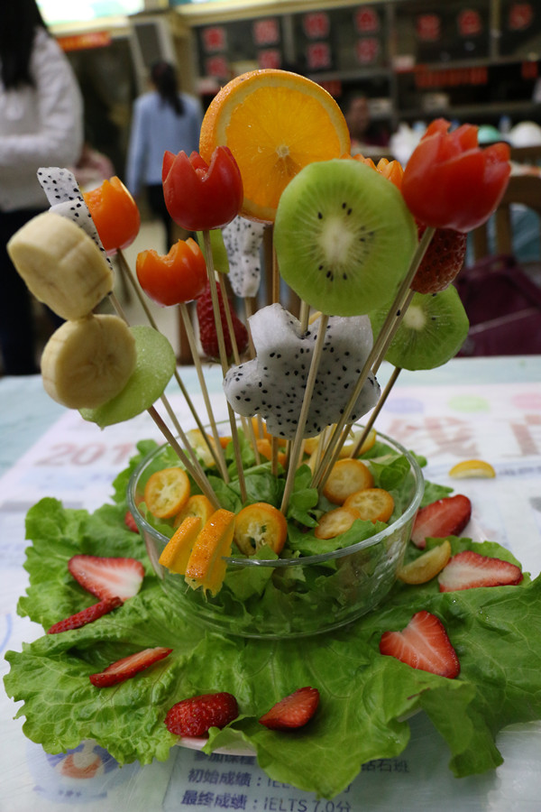 在本次活动最精彩的环节之一——拼盘制作中,参赛选手纷纷拿出自备的食材,动手制作拼盘。在同学们的精心雕琢下,苹果成了一只只昂首的天鹅,西红柿变成了活泼灵动的兔子,芒果成为了小黄人的化身呈现在众人眼前……选手们依次将作品送至评委处,进行一番讲解。评委们在欣赏作品的同时,也品尝了其中的味道——由哈密瓜为主材料做成的“终结猪”,有橙子、沙拉等绘制而成的“表情包”,更有多种水果拼制成卡通人物的“大话西游”……
