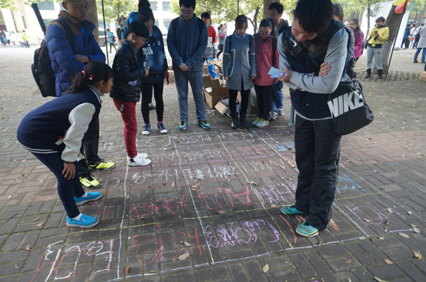 其中“跳房子”的游戏最受游戏参与者的追捧。与印象中的“跳房子”游戏略有不同,本次活动的“跳房子”游戏结合了有关化学的一些简单知识。在每个格子里都有一个化学式或者是化学物质的名称,参与者必须按照一定的规则通过能才算作过关,且过关时间越短越好。过关时间在3秒以内的参与者都能获得一大包棉花糖。“因为过关容易,奖品诱人的原因,所以吸引了很多同学参与,现场气氛十分活跃。”跳房子环节的裁判如是说。