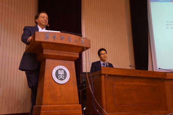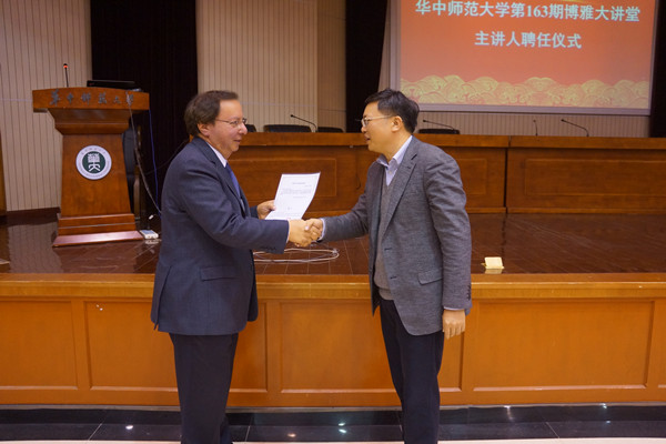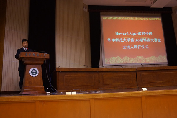 新闻中心消息 记者 陈子颖 陈嘉敏3月22日晚上七点,Howard Alper教授受聘第163期博雅大讲堂主讲人聘任仪式暨Alper教授专题报告会在科学会堂一楼报告厅顺利开展。加拿大皇家科学院院士、加拿大渥太华大学副校长、加拿大科学技术和创新委员会主席兼总裁Howard Alper教授,华中师范大学党委副书记覃红教授,学生工作部副部长李刁老师,华中师范大学创业特区华创俱乐部负责人丁玉斌老师,外事处吴和林老师,以及化学学院党政领导和老师们出席了本次聘任仪式。本次聘任仪式暨报告会由化学学院院长肖文精主持,外事处吴和林老师担任现场翻译。