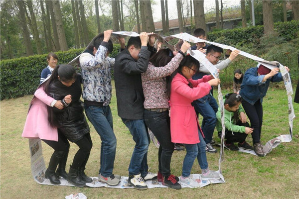 为了增进两个班的友谊,主持人选择了“无敌风火轮”这个游戏环节。只听得主持人一声令下,各队人马纷纷开始动手整理报纸。有的小队选择了将一整张报纸叠成四层,然后用报纸依次用胶布粘起来;有的小队则采取将一整张报纸裁成双份再粘连在一起的方式制作车轮外皮。在各组成员的相互配合下,很快就做成了一个个轮子。小队成员依次站在轮皮内担当内轮,纷纷举起双手,挪动双脚,缓慢前行。尽管一路上面临轮皮断裂的风险,在一片惊呼声中,个队成员均通过默契配合顺利到达终点。