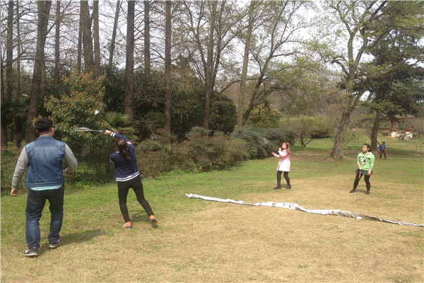 临近中午,在经历了“无敌风火轮”和“疯狂羽毛球”两个消耗体力的环节之后,大家都觉得有些疲惫,于是围坐在一起,在分享零食的同时,分享故事。这个“开心麻辣烫”的环节,要求所有成员,从第一人出发,依次讲一句话;后一个同学需要重复前一个同学说过的所有话。刚开始的时候,大家觉得这个环节很简单,越到后来越发现了这个环节的难度与有趣之处。原来,顺序排在后面的同学需要背出越来越长的话,难免会漏掉一句半句,这时他便不得不向说这句话的那个同学请教。但是人家往往比较调皮,任你抓耳挠腮、绞尽脑汁也哄不出那句话,引得全场大笑。