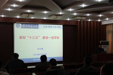 会议首先由学院院长肖文精教授做了题为“谋划十三五建设一流学科”的报告。报告分三个部分:学院现状分析及“十二五”的回顾,学院发展面临的挑战和机遇,对学院十三五学科规划的思考。在过去的五年里,化学学院在人才队伍建设,科学研究,人才培养和社会服务方面取得了长足进步,但同时学院发展也面临着许多困难和挑战,肖院长谈到要想争创一流的学科,必须要在数量和质量上建设一支强有力的人才队伍,要着力打造国家级的高水平研究平台和基地,取得国际公认的有影响力的高水平科学研究和国家级标志性的成果,同时还要有高水平的人才培养。十三五期间,学院将围绕“一个中心目标,四’国’重点突破”来制定方案并分步实施。