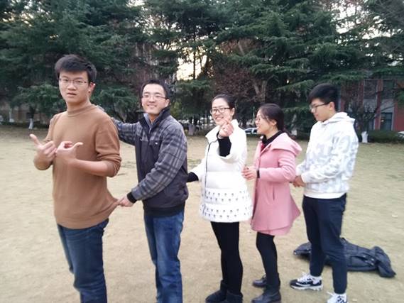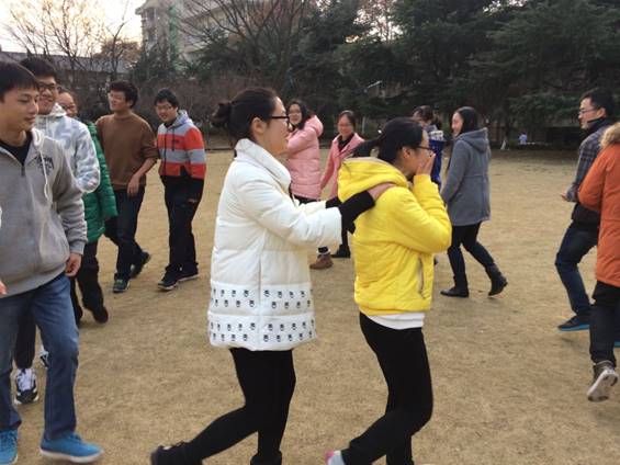 最后一个游戏就是小时候经常玩的“老鹰抓小鸡”。还是按照报数分组的形式,全班同学被分为三组。组成三条小长龙。领头的那个人就是母鸡,负责保护自己的小鸡,并想办法去抓住其他两队的最后一位小鸡。活动开始,母鸡的眼睛滴溜溜的转,时而抓敌方小鸡,时而保护自家小鸡。小鸡们呢?他们纷纷跟着母鸡狂跑,生怕被抓住。活动间隙,靳步发表感慨,这游戏比坐过山车还刺激。