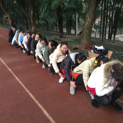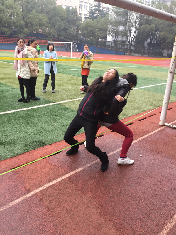 第一环节是蜈蚣走游戏。全班同学分为两组,由组内同学协商起队名、想队歌以及确立队长。两组分别名为‘爷爷队’和‘热干面队’。在主持人对“蜈蚣走”游戏规则的简单介绍后,同学们跃跃欲试,开始了第一轮的尝试,冬天厚重的衣服让许多同学做起游戏感到非常的困难,有的甚至提出放弃,但是为了队伍的荣誉,最后还是选择坚持下来。正式比赛开始后,激烈的竞争下,热干面队取得了胜利。热干面队的队长蔡振华说到:“第一轮的尝试并不成功,队伍中排头的同学十分吃力,也很难跟上我口号的节奏。当正式计时开始时,方法与速度却较第一次尝试有了巨大的进步,我们队迅速完成到达终点只花费了40秒,这连我们自己都不敢相信。”