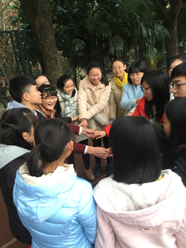解开千千结,同样由原来的两组进行大组比赛,同学们先围成一个紧凑的圈,手拉手,记住左右手的同学后,开始四处走动,变换位置,主持人下令后,站在远处,拉起原先左右位置同学的手,开始计时,在最短时间内解开结的队伍便获胜。爷爷队的同学们,在解结的过程中,使用了多种方法,如:让中间的同学蹲下,外围的同学跨国他的双臂进入内圈等……而热干面队也不甘示弱,在杨轶与蔡振华的指挥下,又一次摘得桂冠。结束游戏后,班长蔡冬雪说道:“这个游戏,就好比在生活中我们所遇到的,集体学习生活时的各种心结,各种困难。尽管看起来繁琐,但只要每一个人投身进去,勇于创新勇于变更,团结信任彼此,定会取得成功。”