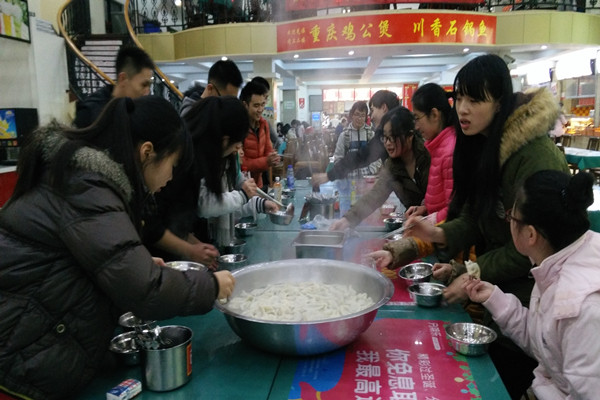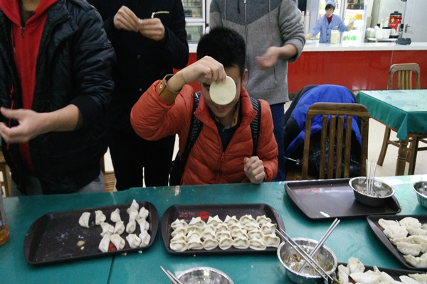 在食堂工作人员的帮助下,一大盆热气腾腾的饺子被三个男生抬上了桌。面对刚出锅的饺子,很多人既兴奋又忐忑,不知道自己做的饺子到底味道如何。几个男生以身试险,从皱眉到一声“恩,还不错”打消了同学们心底的顾虑,开始一哄而上,迫不及待的开始品尝美味的饺子。可是我们的“彩蛋”还在,部分同学“幸运”地吃到了各种奇葩馅料的饺子,只能皱着眉头往下吞。齐娟同学更是吃到了一个皮包皮的生饺子,好不奇怪,同学们都开始相互猜测始作俑者。刚吃完饭的陶前志同学,一个人就吃了二十多个饺子,面对同学们的惊叹声,他笑笑回答道“开心就好”。