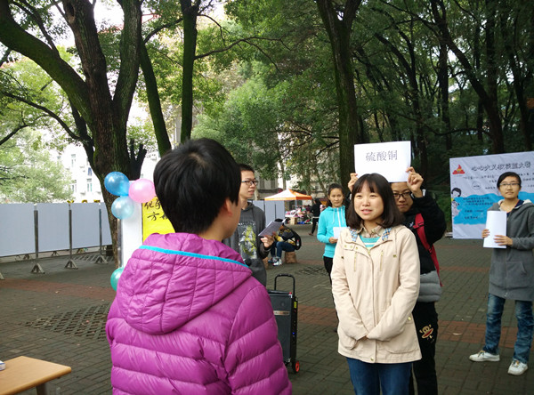 “木犀”队进行比赛时,他们拿到的词条是“硫酸铜”,提问的选手问了许多相近的物质,如“硫酸镁”、“硫酸锌”、“硫酸钡”,可就是没猜“硫酸铜”。看到他们每次与正确答案擦肩而过,一旁围观的同学都急的跺脚了。终于,提问的选手试探性的问了一句:“硫酸铜?”,还没等到队友回答“yes”,在场的同学都欢呼起来:“yes!”比赛气氛扣人心弦。