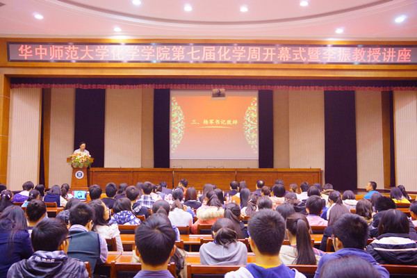 新闻中心消息 记者 陈嘉敏 蔡振华1日晚,由共青团华中师范大学化学学院委员会主办,化学学院团委学生会承办的第七届“化学周”开幕式暨李振教授讲座在科学会堂一楼报告厅顺利举行。武汉大学化学与分子科学学院教授李振、华中师范大学化学学院院长肖文精、党委书记杨军、副院长刘盛华以及党委副书记范重庆出席了本次开幕式。开幕式由化学学院2015届团委学生会主席林芳婧主持。