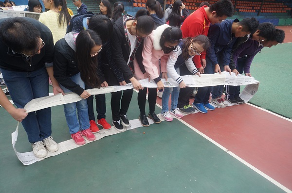 在本轮游戏中,各组组员都积极开动自己的脑筋,用各种办法尽可能快地用有限的报纸做出最结实的圆环。其中,第四组成员做了一个仅能容纳组员们的脚而不是整个人的圆环,这样的圆环更结实、更便于行动。最终第四组用时最短,凭借其创新的方法获得了本轮游戏的第一名。
