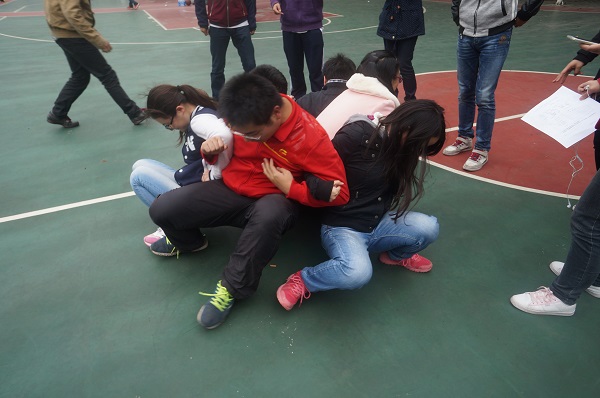 最后一轮游戏——“你踩呢”。所有组的成员脚绑两个气球重新分成两个大组。两组互相竞争,踩爆对方组气球的同时要保护好自己和同组成员的气球,最后剩余气球数最多的一组获胜。本轮游戏中,女生们不顾淑女形象,男生们不顾绅士风度,偷袭,围攻,各种手段齐齐上阵,战况异常激烈。