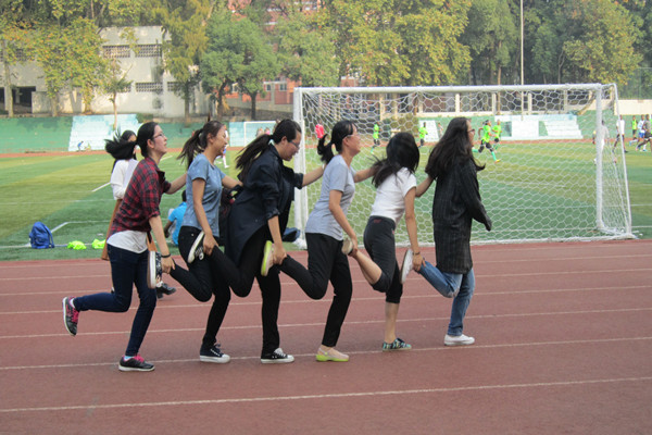 第二阶段为游戏环节。这一阶段安排了以“江流千里”、“同心协力”、“怪兽来了”、“我要吃香蕉”、“五人六足”为主题的五个小游戏。各队按照事先分好的指示在不同区域同时开展游戏。一时间,体育场的气氛火热异常。“吃香蕉”区域内,背靠背的两位同学配合默契,旁边队友们都大喊着“快吃!快吃!”。吃的同学腮帮子大鼓,不顾形象,只为团体荣誉,狼吞虎咽地把香蕉大口往里塞。“江流千里”的同学们为了更多地传输水,不惜用上瑜伽姿势,队员们在一旁指导加油,队员连衣服上沾湿的水也拧一拧滴到计分的烧杯中,真正做到“不浪费一滴水”。怪兽区的“大怪兽们”也是千姿百态,同学们为了达到要求用出了各种奇思妙想,看得场边的裁判们也忍俊不禁。前面的游戏已经完全炒热了气氛,然而“五人六足”的进行才是引爆了活动的高潮点。所有队伍两两PK,在红跑道上,大家或挽手或搭肩,相同的是“一二、一二!”的口号,响彻全场。最后以安晓蕾老师为代表的女生队和团委学生会男生队进行了最终PK。赛道两边站满了围观的同学,人人拿着手机,记录下这一刻。