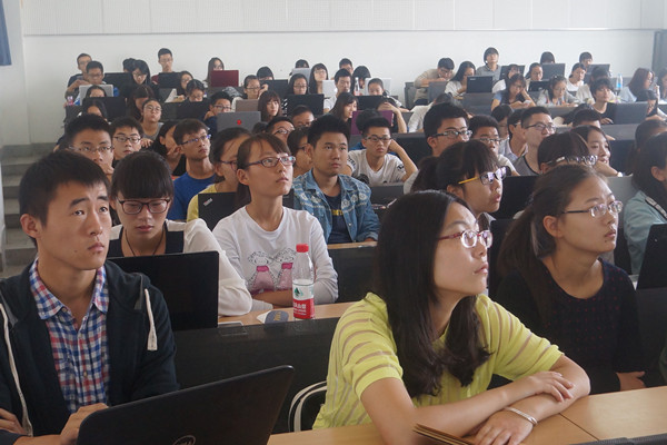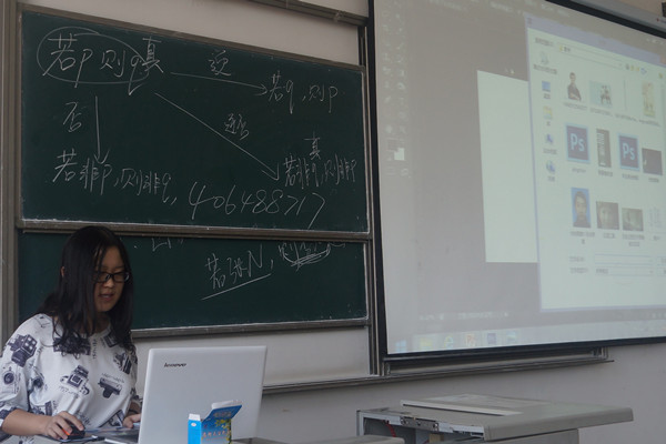 “接下来我来教大家怎样抠图,怎样使用撤销键。”在场的同学都在认真听李静传授她的作图经验,场面安静。在随后的一个环节中,李静首先展示了一张马云的照片,接着利用它讲授了如何使用画笔工具使图片更加有趣。当屏幕上马云的脸一会儿白一会儿黑,在场的同学们都笑成了一团,现场