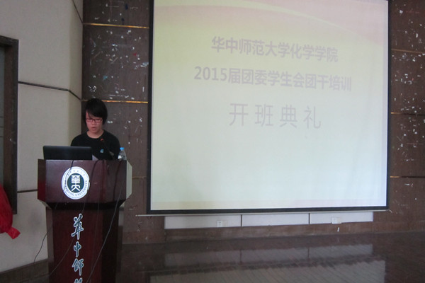 新闻中心消息 记者 陈嘉敏 蔡振华11日下午,华中师范大学化学学院2015届团干培训开班典礼于九号楼一楼报告厅顺利举行。化学学院分党委副书记范重庆、团委书记安晓蕾、2015级辅导员马莹、团委学生会各级学生干部及新任助理参与了本次开班典礼。典礼由组织部部长谭秋鸿主持。