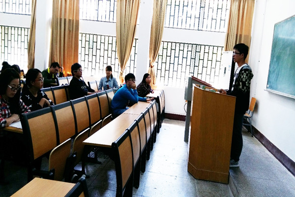活动开始,班长吴进松在简单地说明活动流程过后宣布本次团日活动开始。随后,杨丹茹、贾雨婷、钟水彩、王玥四位同学依次围绕主题上台发表演讲。