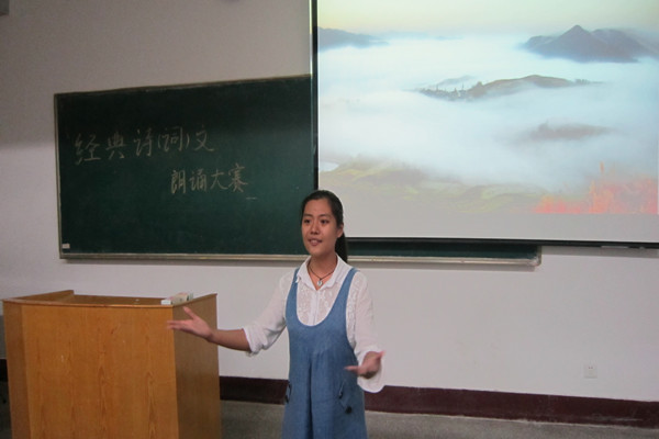 本次比赛内容精彩纷呈,参赛选手将古现代诗词配上和谐的音乐、画面以朗诵的形式表现,深情款款的低吟浅唱、铿锵有力的激昂诵读,将诗词字里行间的情感抒发得淋漓尽致。比赛首先在何心雨同学一首意境雄伟、深沉激烈的《梦游天姥吟留别》中展开,该诗是唐代大诗人李白创作的一首古体诗,其内容丰富曲折,形象辉煌流丽,富有浪漫主义色彩的特点结合朗诵者慷慨激昂的表现,感染了在场的每一个人。