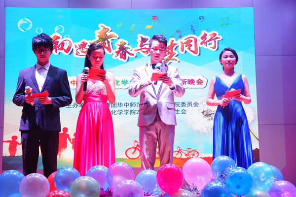 新闻中心消息 记者 (文/王晓琦陈子颖 摄影/陈嘉敏 潘越芸)20日晚,由共青团华中师范大学化学学院委员会主办、化学学院2015届团委学生会承办的“初遇青春,与梦同行”迎新晚会在大学生活动中心五楼顺利举行。化学学院党委书记杨军、党委副书记范重庆、15级班主任龚静鸣、各年级辅导员及2015级新生出席了本场晚会。