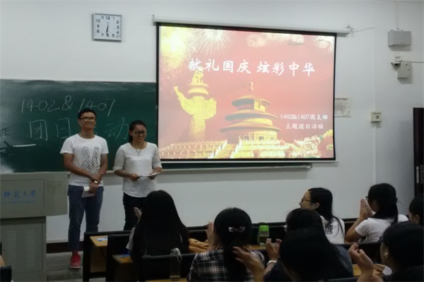 新闻中心消息 通讯员 丁磊 叶炜欣18日晚,化学学院1402、1407班九月团日活动“献礼国庆,炫彩中华”在7207教室顺利举行。1402及1407班全体同学参加了此次活动。晚六点半,团日活动准时开始,由二班班长王万领及七班团支书骆元元主持。
