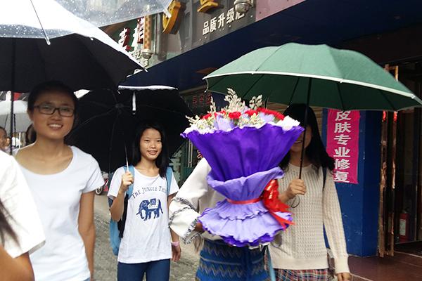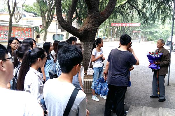 出发时,尽管天公不作美地下起了小雨,但却无法阻挡同学们前去看望老干部的脚步,团支书夏婷婷与贾雨婷同学更是当起了“护花使者”,一路上小心翼翼地保护着将要送给老干部们的鲜花。