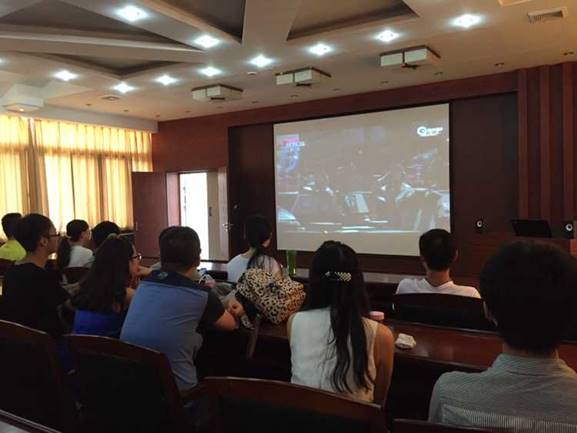 上午8点30分,就陆陆续续有同学前来报告厅就坐观看,大家都十分期待这次大阅兵。9时,视频直播正式开始,透过画面可以看到习近平夫妇迎接外宾的场景。