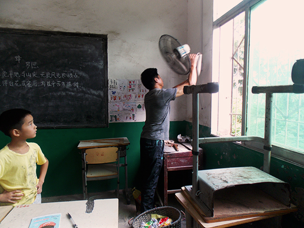 正式支教的第一天,队员们看到教室里只有基本的上课设施,粗制案板的讲台、掉灰的墙壁、碎玻璃的窗户、掉漆的木门。教室里,湿漉漉的衬衫和发丝,教室的墙壁和天花板空荡荡的。第二天一大早,校长们老师们亲自搬来了电扇、擦拭灰尘、钉钉子、架电扇,每架好一台电扇,都会询问好几个周围的孩子有没有吹到风,不断调整,直到孩子们都点头才小心地把桌椅放回原位,开始下一台电扇的安放。这一幕幕,孩子们看在眼里,支教队员们也看在眼里。于是有些孩子们也开始帮着擦电扇,小小的手里拽着大大的抹布。