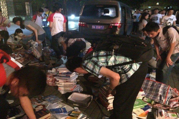 晚上九点四十,大家准时在南门严氏教育书店集合,一起在书店门口整理书本,并按照不同的价格类别将书本分开。多个过往行人在听说了支教队的捐书目的之后也都主动上前挑选图书购买。十点半左右,队员们将清理好的图书卖给了书店。