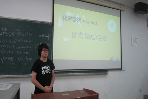 新闻中心消息 记者 陈子颖22日下午,化学学院2014-2015学年度第五期团支书联席会议在8207教室召开。出席本次会议的有化学学院团委书记安晓蕾,原团委副书记傅红,第一团委副书记刘运航、第二团委副书记朱子慧,原团委学生会组织部部长翟芸梅,团委学生会宣传中心部长林仪,副部长陈嘉敏、陶前志,组织部副部长王皓明、李丹悦以及2012级、2013级、2014级年级和各班团总支。本次会议由化学学院团委学生会组织部部长谭秋鸿主持。