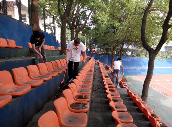 清理的进展很快,但由于体育场边的座椅是学校日常清洁的盲区,加之近日多雨,夏日里梧桐絮飘飞,残枝落叶四处散落,座椅上满是灰尘、积水和枝叶,打扫起来并不是那么容易,往往费了好大功夫擦了半天,却依旧满是污垢。对此,同学们只能付诸更多的努力。