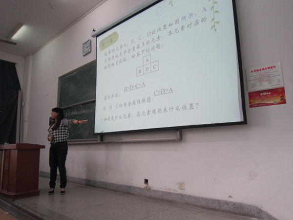 紧接着,第二位选手翟芸梅上台,同样依次进行了三个环节。二号选手不仅仅准备了几道贴合知识点的练习题,更有小小的科普内容,拓宽学生知识面与眼界,其平稳、有内容、突出重点的授课风格获得了评委的一致好评。以“元素周期表与元素周期律的应用”为主题,并发表“化学,让生活更美好”的观点,让学生感受到了化学的魅力。在现场提问环节,李佳老师向她指出了专业知识上的小小错误,翟芸梅选手态度恭敬认真,仔细听过后及时纠正。
