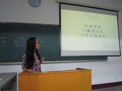 首先,由化学学院团委副书记傅红对本学期开展的团日活动进行总结。在表达对本学期各班团日活动赞赏的同时,其指出在宣传上仍需要加强,希望大家再接再厉,把团日活动办得更好。