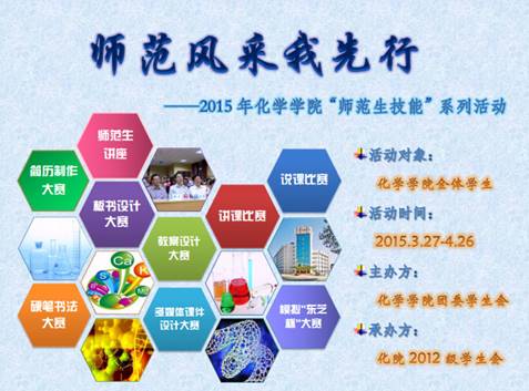 此系列活动由化学学院团委学生会主办,化学学院2012级年级学生会承办,旨在激起同学们对教师职业的热情,提高同学们的师范技能水平,并为日后从事教育事业的同学们积累教学经验,在就业时拥有更好的竞争优势。同时,也可让非师范学生体验教育事业点滴,增强其对教师工作的了解。