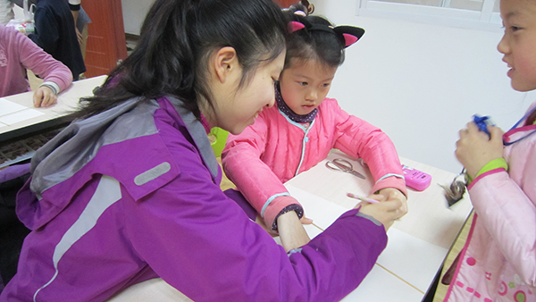 接下来就是做风筝的骨架,志愿者和孩子们一起将骨架缠好,固定在孩子们自己创造的“衣服“上,然后再缠上长长的细线,整个风筝就这样制作完毕了。