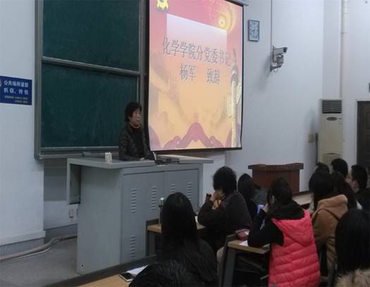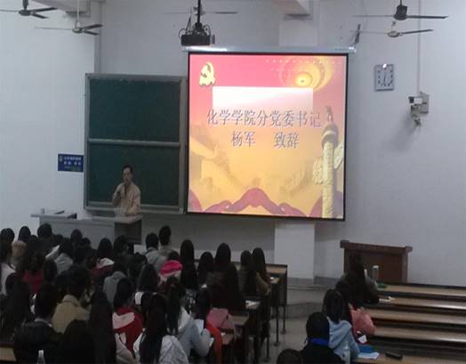 随后,化学学院杨军书记对参加本期培训班的同学表示了祝贺,并指出党课培训班旨在提高同学们的思想觉悟,加深同学们对新时代党的认识。杨书记表示端正入党动机、引导同学们以积极上进的态度对待事物是党课培训一直以来的目的。同时,杨书记也对同学们提出了几点要求:一是树立正确的信仰,从思想上去入党;二是向优秀党员学习,将自己的命运和国家的命运连接在一起;三是充分珍惜机会,认真学习党校的各项知识,提高自己的政治素养。杨书记还表示,希望同学们能不断充实自己、提高自己、完善自己,并预祝同学们成功完成党校各项任务。