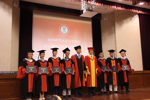 学位授予仪式在化学学院副院长刘盛华教授和万坚教授分别宣读完“关于授予博士、硕士学位的决定”、“关于授予学士学位的决定”后正式开始。亲切的校歌声中,2014届博士毕业生、硕士毕业生和本科毕业生依次登台,副校长李向农教授和院长杨光富教授为获得学位的同学们授予学位证书、拨正流苏并合影留念。