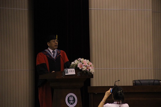 在庄严雄壮的国歌声后,化学学院院长杨光富教授为本次毕业典礼致辞。杨院长首先向2014届的全体毕业生们圆满完成学业表示了热烈的祝贺,并向毕业生们提出了几点希望:希望毕业生们毕业后能坚持学习、超越自我、珍惜今天。杨院长将人生比喻成一系列的化学反应,鼓励毕业生们翻越一个个反应能垒,书写精彩人生。